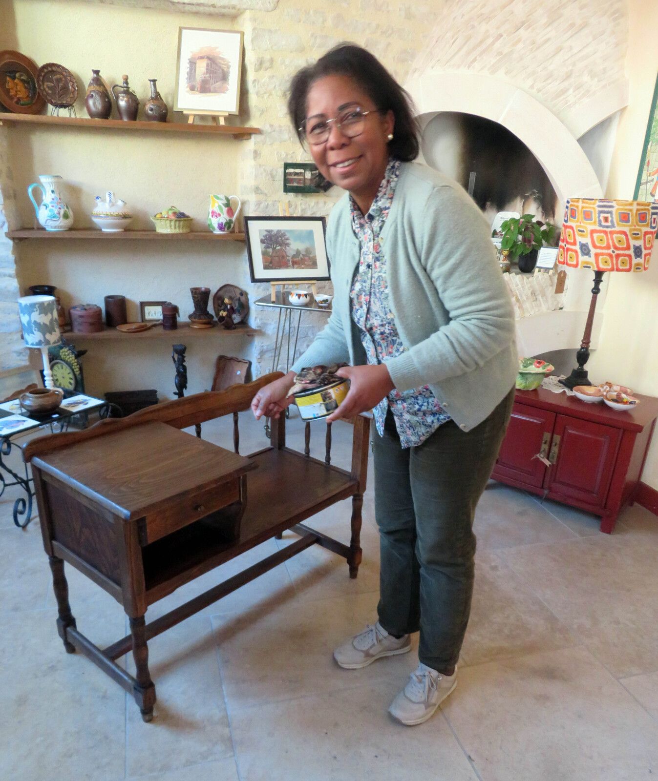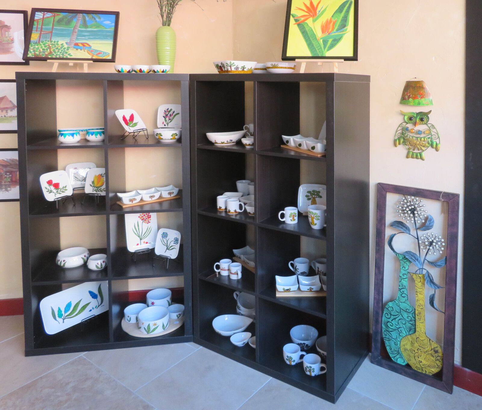 Dans sa boutique on trouve des objets décoratifs, d'autres utiles, et des tableaux ...
